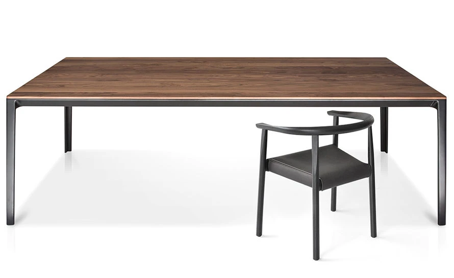 The thin beveled edge adds visual lightness, while the aluminum frame gives strength. Wood top is veneer with a solid wood edge and the frame is available in graphite and is extremely lightweight. Polaris is smooth and velvety to the touch. it is highly resistant to scratches & heat, as well as being anti-fingerprint. The curious combination of durability and velvet smoothness makes Polaris the ideal choice for ultra contemporary projects.