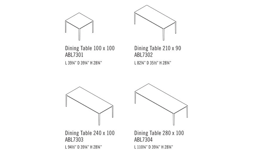 Able dining 240: 94.5″ L | 39.25″ d | 28.75″ h