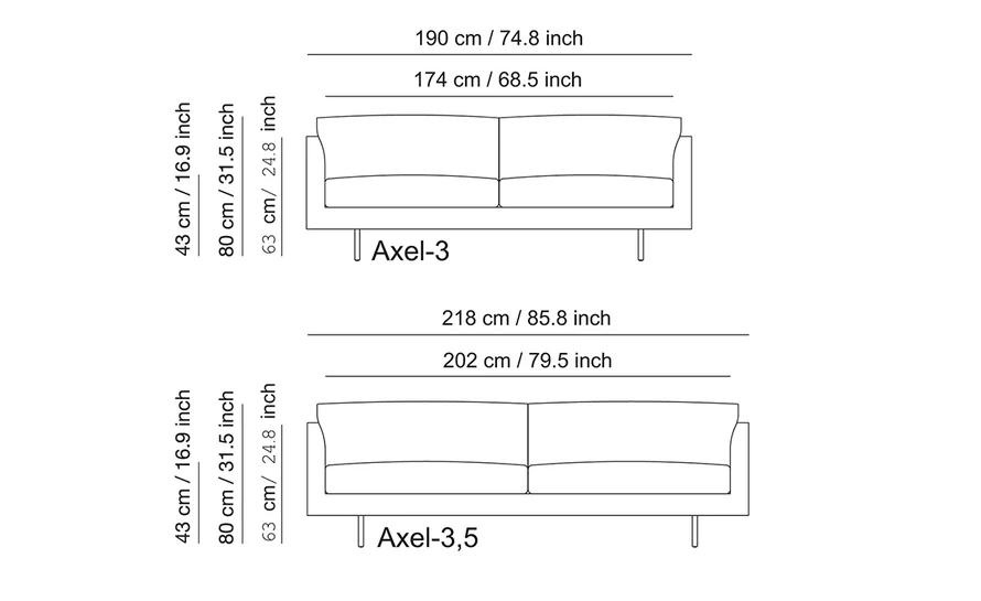 Axel is offered in a variety of fabrics and leathers with your choice of leg options. Sofa does not include extra throw cushions shown in photos. Please note: Axel sofas specified in leather will have extra visible seams.
