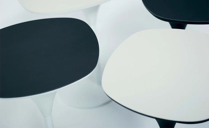 The Bloomy table features a black or white varnished steel base and steel column with matching plastic sleeve. The top is MDF with a Laminam® surface.