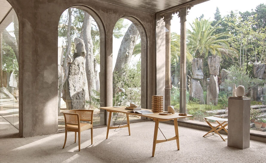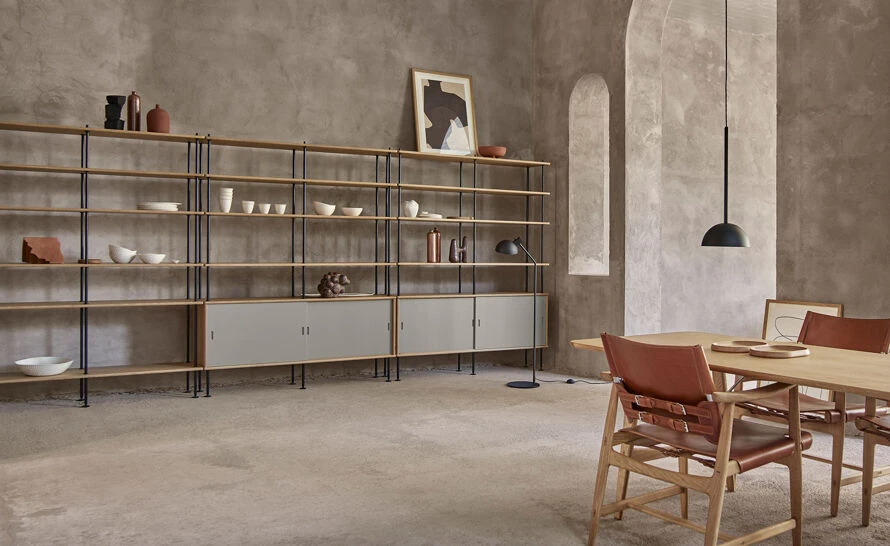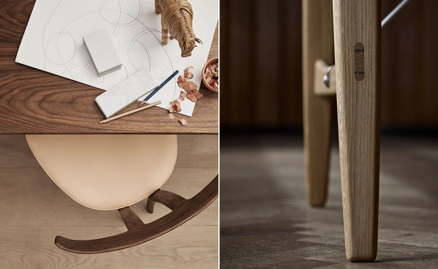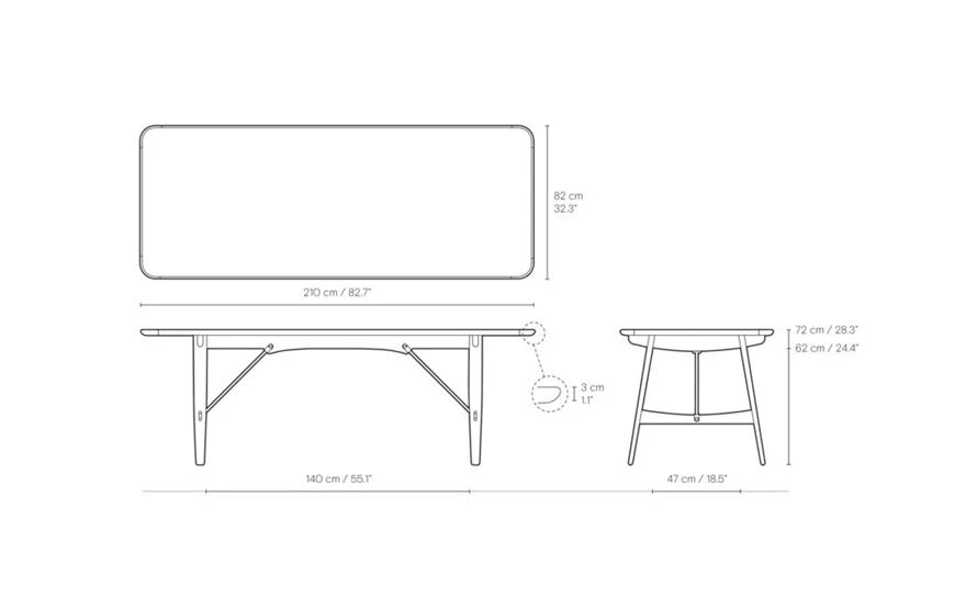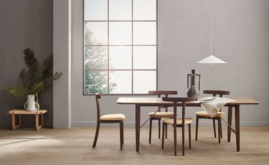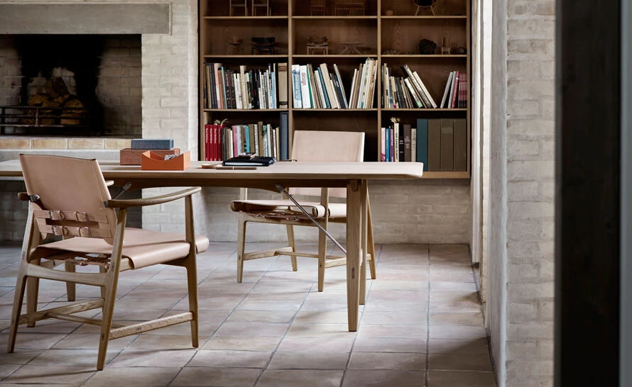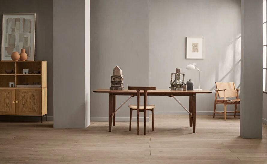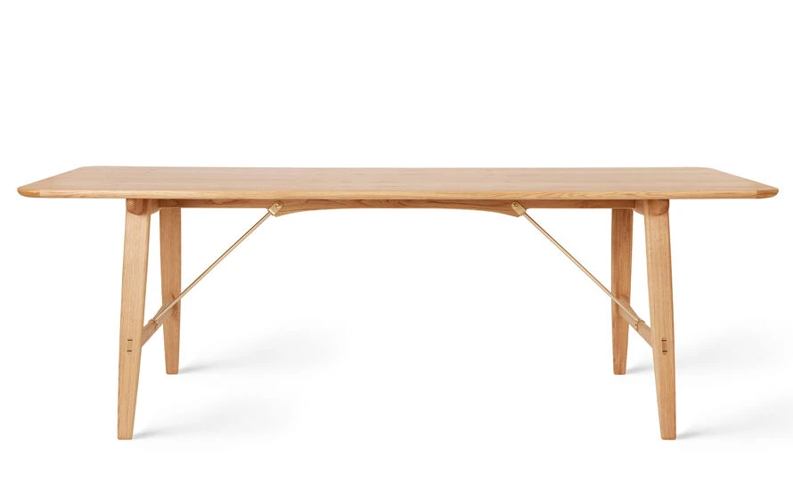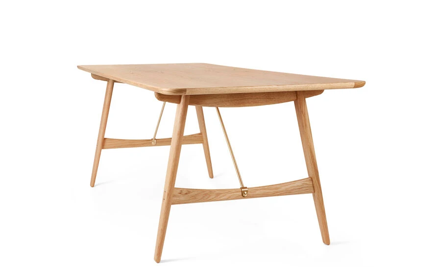 Børge Mogensen designed the BM1160 Hunting Table for the Copenhagen Cabinetmakers’ Guild Furniture Exhibition in 1950. The name refers to the “Hunting Cabin” theme of the Guild’s exhibition, a detail which is also reflected in the table’s robustness and wood-focused design. The table combines excellent woodwork with elegant metal brace bars, creating a bold and organic whole.