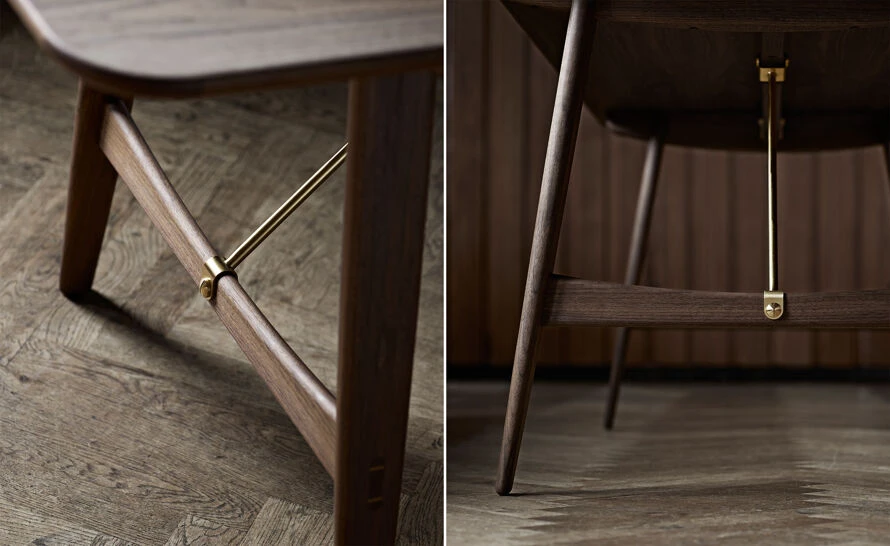 The stability is ensured through the use of two diagonal brace metal bars connecting the tabletop and frame with an aesthetically pleasing effect. Further detailing, such as the mortise and tenon joints on the legs manufactured in contrasting wood, accentuate the table’s handcrafted expression.