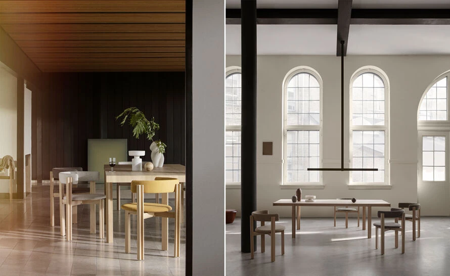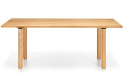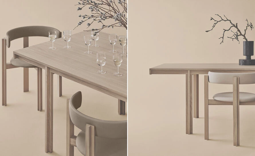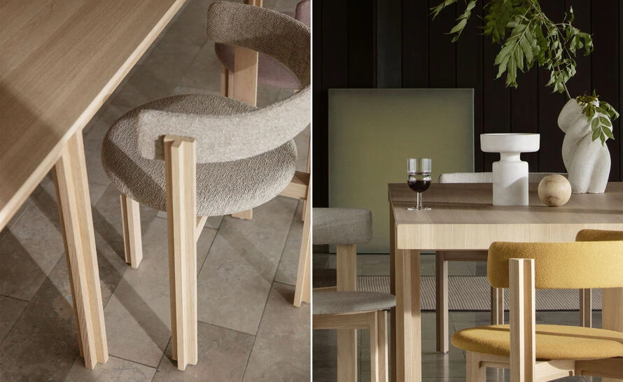 The solid wood dining table boasts a clarified form, repeating a simple angle throughout table legs and ends of the table top, while the dining chair with its circular seat and gently rounded backrest, beautifully upholstered, adds a softness to the clear, unfussed geometry, an invitation to linger.