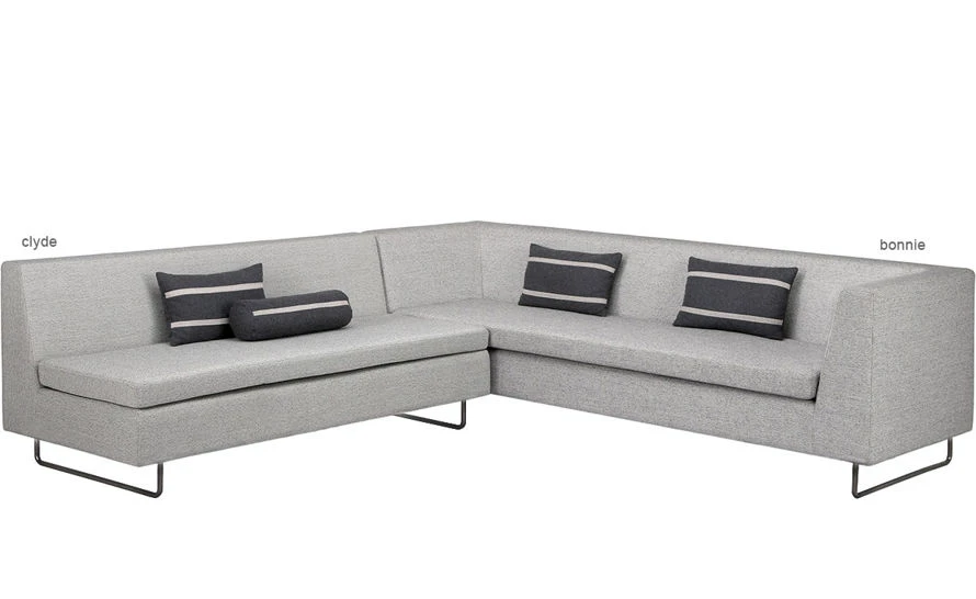 The Bonnie collection lets you choose between a well-tailored sofa and a sleek sectional. Bonnie is armed and dangerously comfortable, and Clyde has no arms for extra-wide lounging. Each is available separately, but when these two get together they can really work a room. Available in your choice of upholstery. Throw pillows shown in pictures not included. Assembly required.