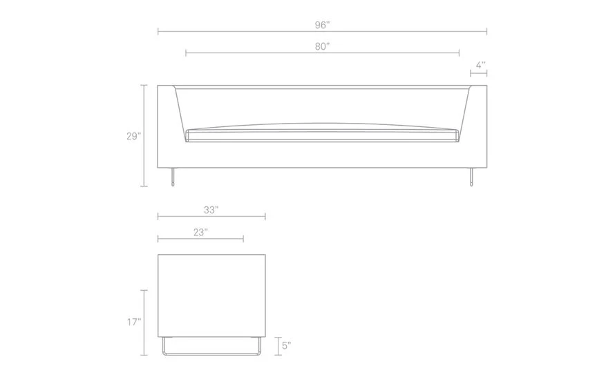 96″ w | 29″ h | 33″ d | seat: 17″ h | 23″ d | 80″ w | legs: 5″ h