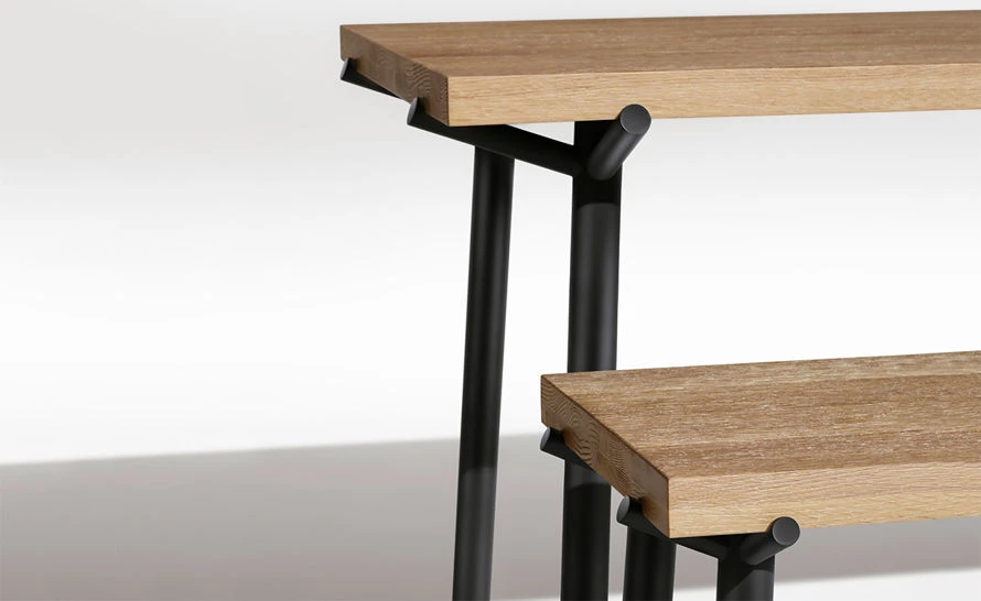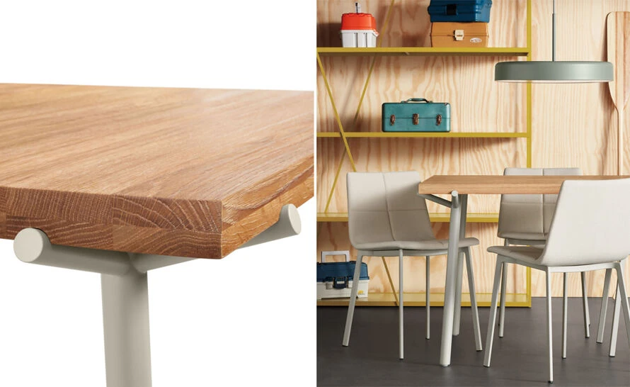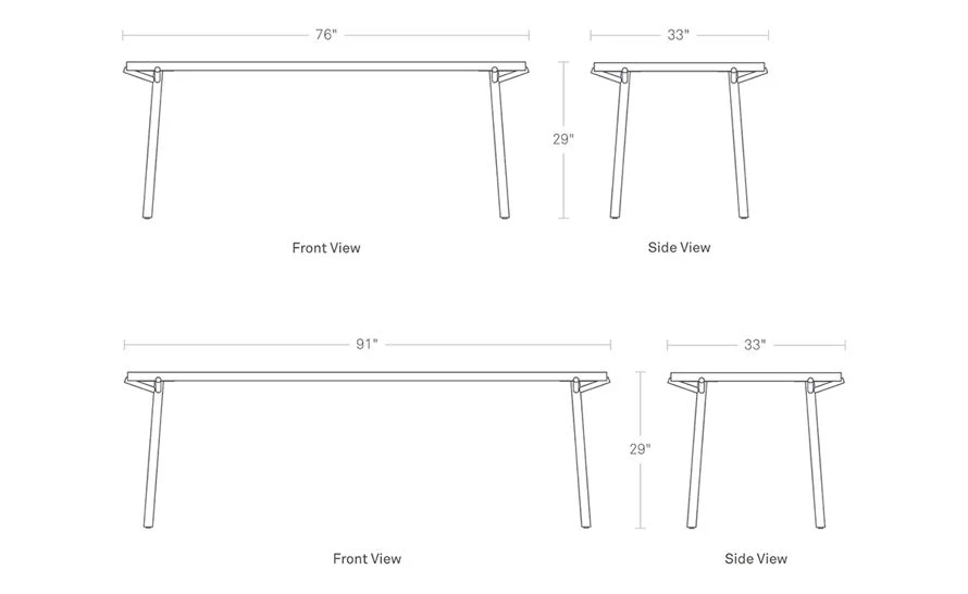 The Branch dining table sits on sculptural powder-coated steel legs handsomely prop up solid weathered oak. It is available in two sizes: 76″ and 91″.