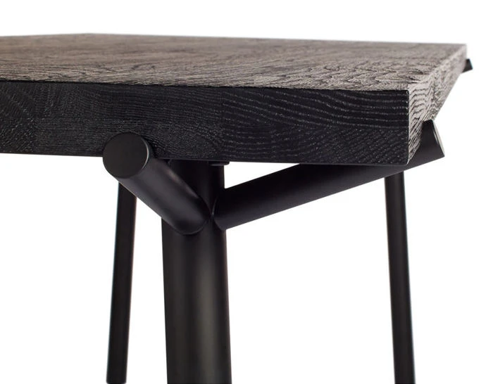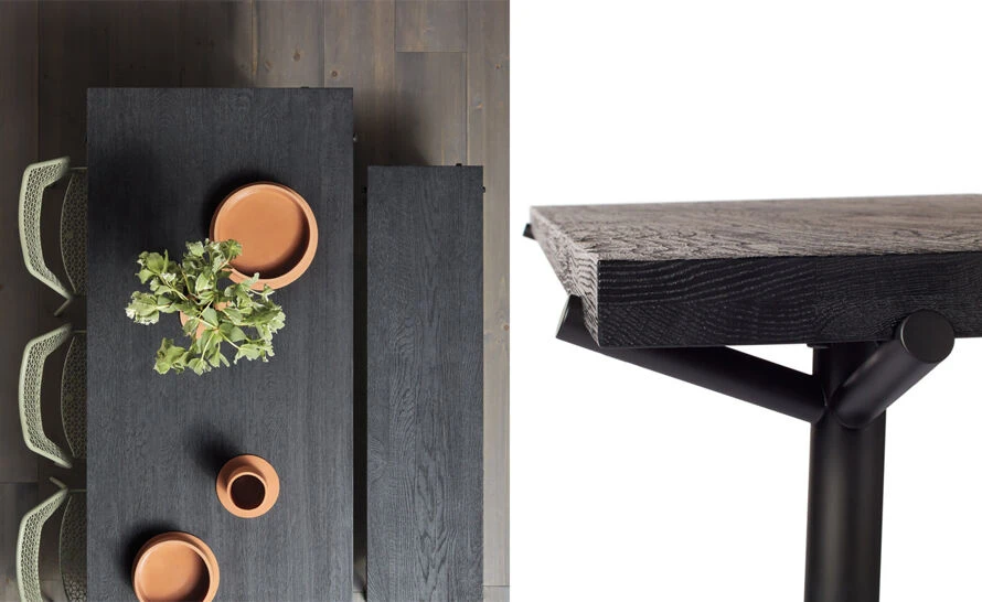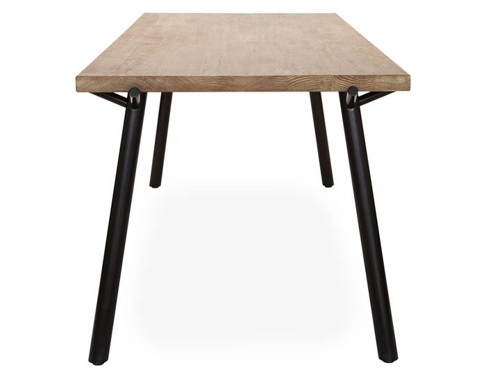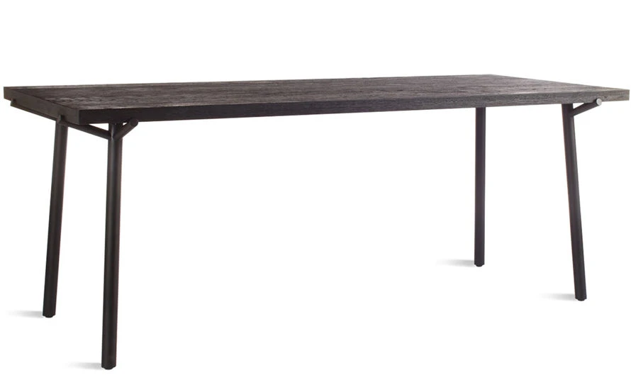 The Branch dining table is a modern reclaimed wood dining table. It features a solid weathered oak wood top. This means that it may react dynamically to its environment and swell and crack with changes in humidity and temperature, this is normal. The legs are powder-coated steel.