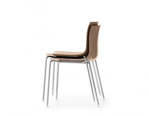 Made for both residential and contract use, indoors and out, the Catifa 46 shell and base are fabricated in a diverse range of materials, colors and finishes. The shell is constructed in double- curved plywood, mono- or bi-color polypropylene (an exclusive process pioneered by Arper), covered in leather or fabric or finished with upholstered pads. The base comes in chrome-finished steel, satin-finished stainless steel, aluminum or powder-coated aluminum and is available in the following base configurations: sled, four-legs in tube, aluminum trestle and five-ways. The sled and four-leg bases are stackable to allow for large-scale use and storage. A table accessory is available for campus or auditorium use (please call for details). Catifa 46 is also available as a stool.