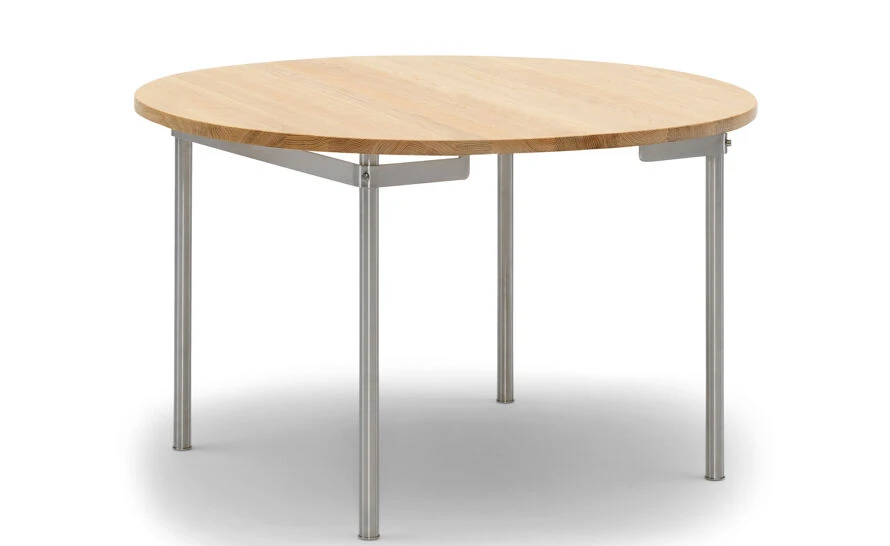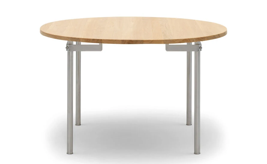 CH388 is available in solid oak in your choice of finish. Each table top is made from solid wood and the base in stainless steel. CH388 is also available in a version with optional supporting wood leg in black, which accommodates expansion leaves, please call the hive showroom for details.