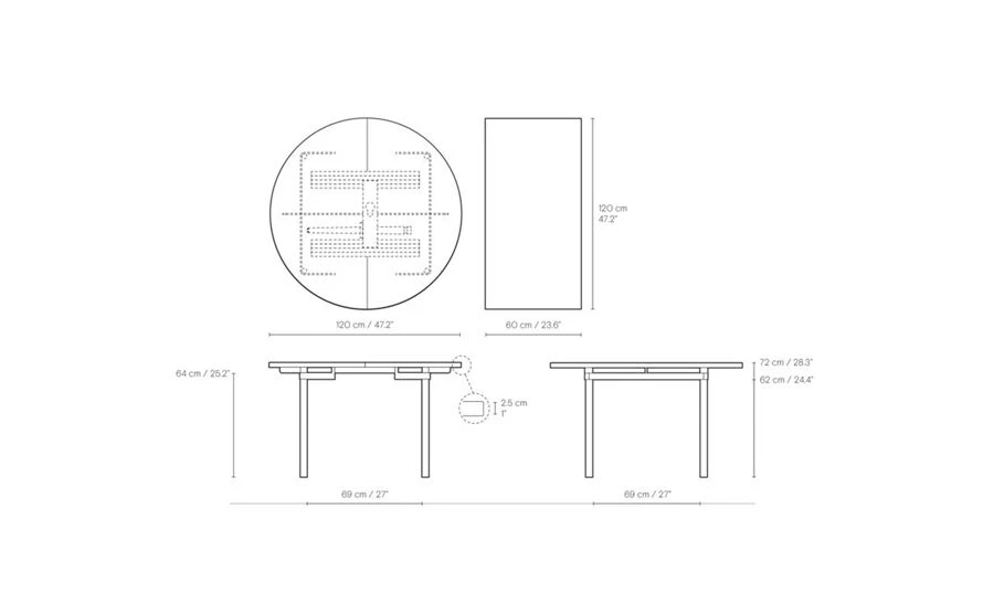 CH388: 47.2″ dia. | 28.3″ h | table top: 1.1″ thick | distance between legs: 27″