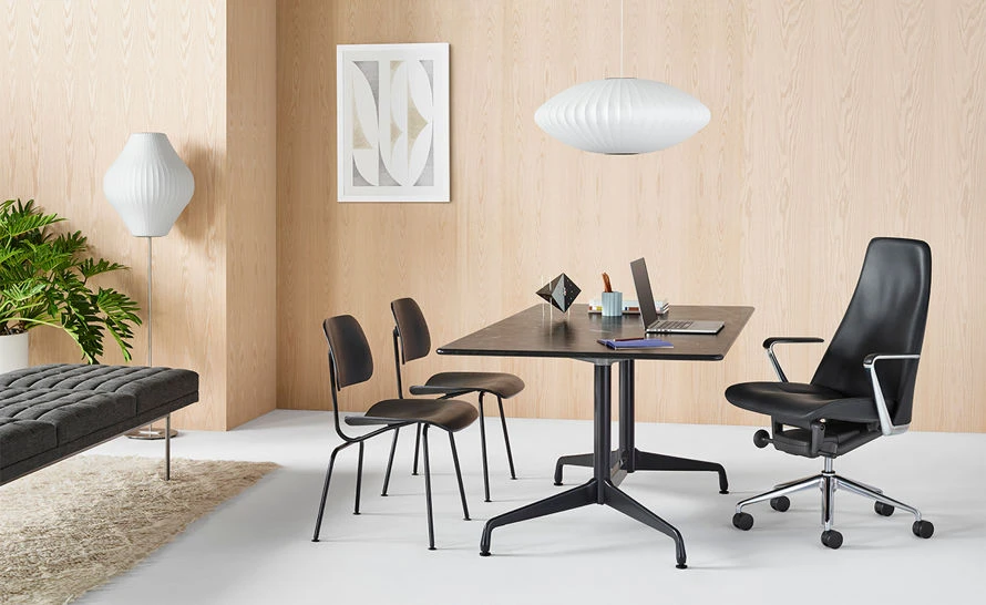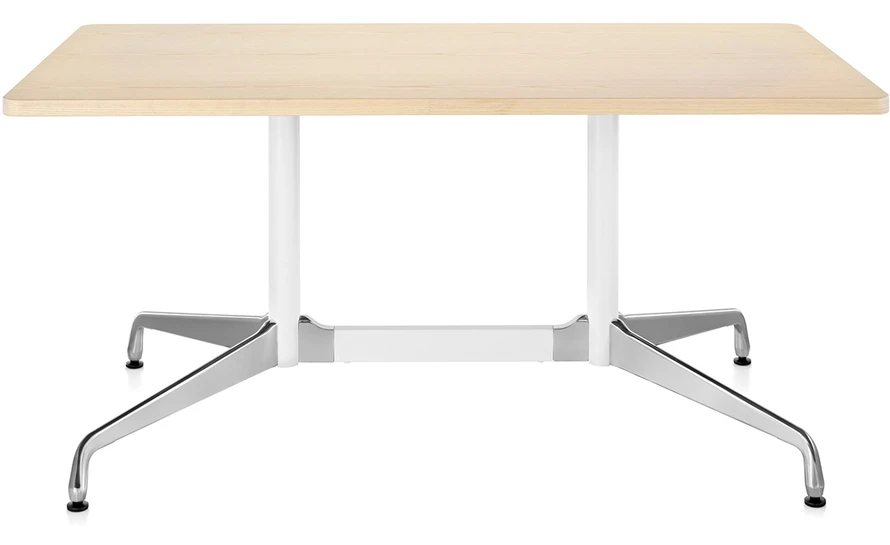 In 1958, the office of Charles and Ray Eames designed a table with a single segmented base, constructed of modular units, that could support tops of different lengths and widths. The strength and versatility of the lean and simple base design made it possible to produce tables in a wide range of sizes.