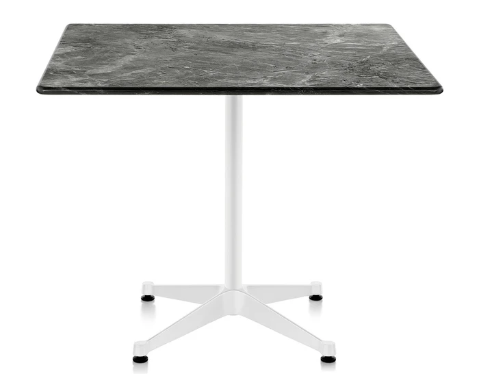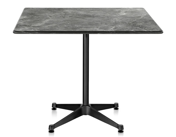 Once extracted, two centimeter-thick slabs of stone are cut to order with a bull-nosed edge and given an eggshell-like honed finish. The four-legged cast aluminum base is available in two powder-coat outdoor finishes. Tops and bases are connected with a bolt that runs the length of the column to ensure strength and durability through years of use. With matching bases and complementary finishes, these tables go especially well with the Eames Aluminum Group Outdoor chairs.