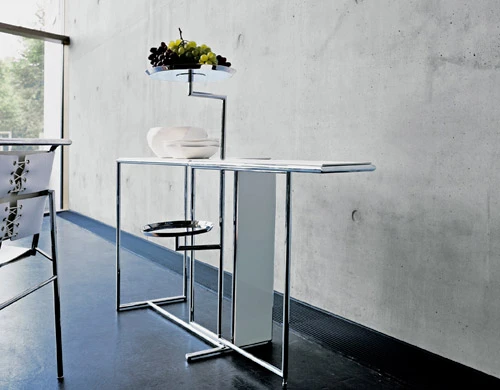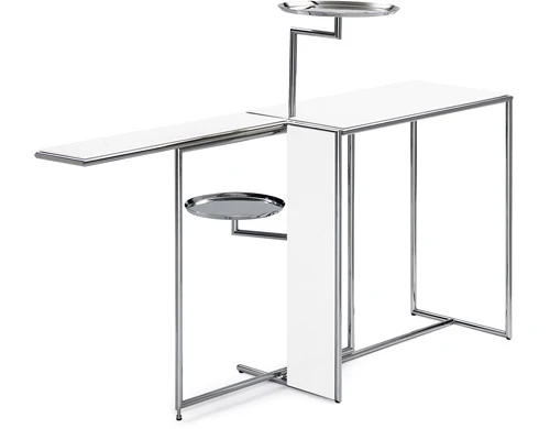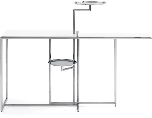 Rivoli served as the tea-table in the living room of Eileen Gray’s summer house E 1027. The graceful lightweight that no doubt was used on the terrace when necessary, is a lovingly thought-out, versatile piece of furniture for times of rest and relaxation. Everything is ready to hand: shelves swivel to bring fruit, pastries or sweets within easy reach and the table-top can be extended by raising a side leaf.