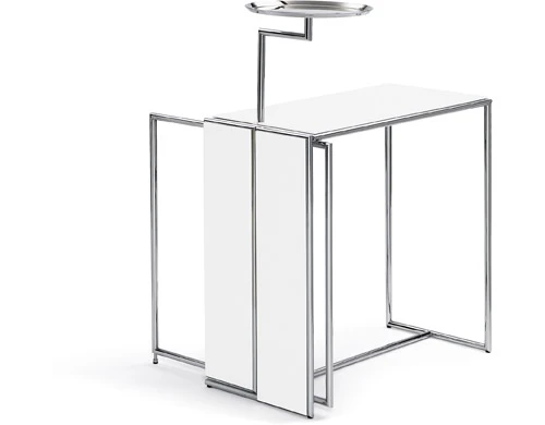 Authorized by The World Licence Holder Aram Designs Ltd, London. Rivoli was originally conceived as a tea table and features a foldable table-top and two swivelling trays. The frame and trays are chromium-plated steel. Table-tops are MDF high-gloss lacquer finished in black, white, grey or Chinese red.