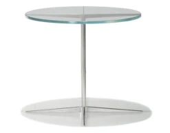 As uncomplicated as they are beautiful and functional, Facet tables are a delicate, yet structured interplay of glass and polished stainless steel. Resting on four tapered extensions radiating from a delicate steel column, the glass tabletop seems to float in mid-air.