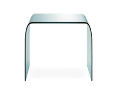 The Fontana series consists of four tables in various sizes. There is a side table, two coffee tables and a console/sofa table. Each table is carefully constructed of curved and ground 0.6″ thick tempered float-glass. A beautifully elegant piece which was selected by the Museum of Modern Art for their permanent collection.