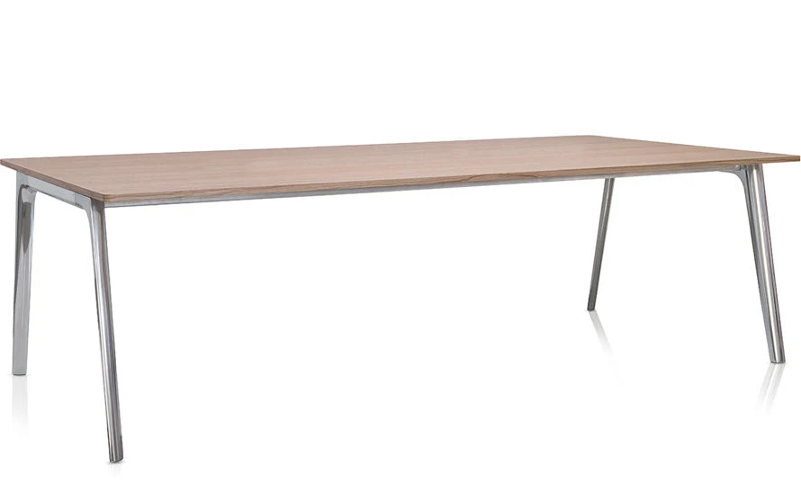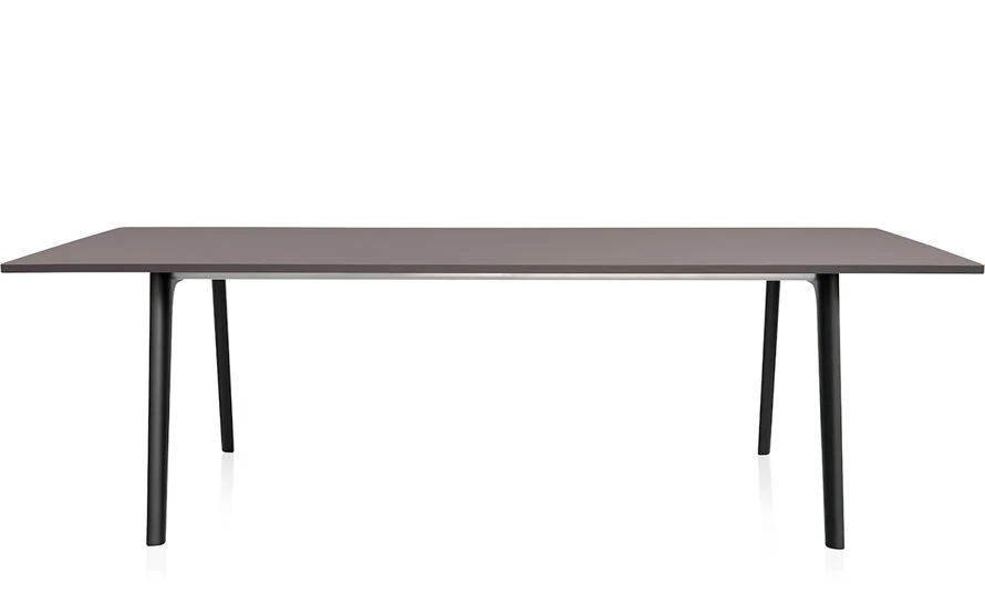 The series is various size & surface selections. The corners of the table top are rounded to give the table top a sophisticated finish. The table tops are made of Chipboard core and matching ABS edge band, of either 20 or 22 cm. The legs of the base are positioned and shaped in such a way that the user will always be met with a soft circle creating an invitation to come closer and use the table. The base is crafted in pressure die-cast aluminum and the rails are extruded aluminum. It can be specified in polished aluminum or powder coated in black IGP lacquer. The table is mounted with glides.