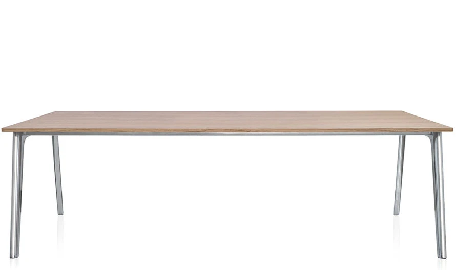 The Pluralis table comes in 3 sizes with 5 table top selections; mauve brown linoleum, lava grey or white laminate and oak or walnut veneer. The aluminum base comes in polished aluminum or black powder coated aluminum. The table offers the possibility of adding optional cable management system, to be used as a working desk or a meeting table (please call the hive showroom to specify cable management system).