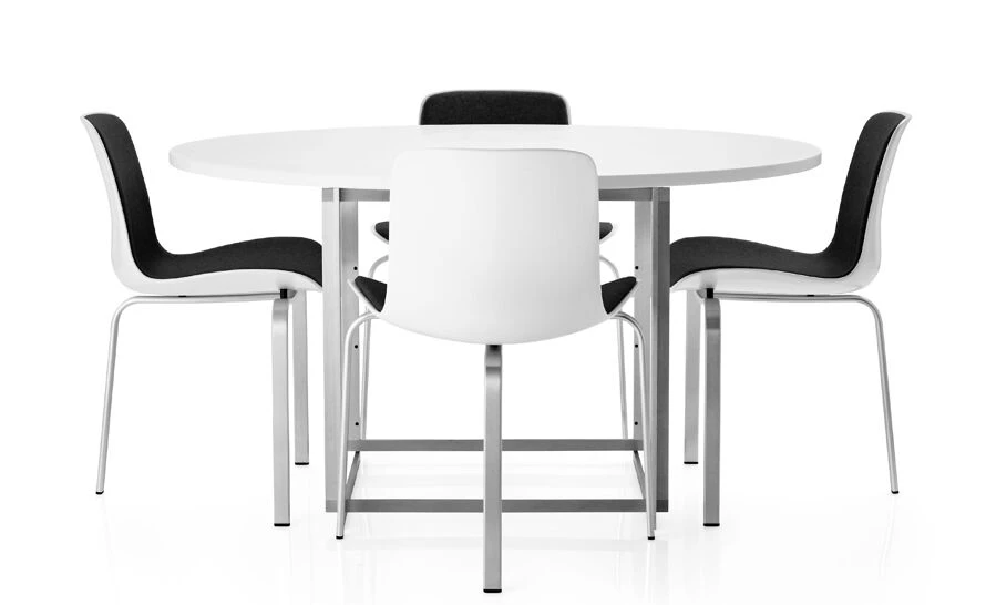The table top is made of a white polyester composite, and the base is anodized satin brushed aluminum.