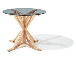 Construction notes: Each table comes stamped with the KnollStudio logo, Frank Gehry’s signature and the date of production. Features hard white maple veneers; all wood grains run in the same direction for resilience. Solid maple center column prevents cracking. Arched base design provides ample leg room. Glides are clear plastic with matte frost finish. Finishes; Top comes in a choice of two finishes: .5″ thick tempered clear glass or .6″ thick textured white laminate top with clear solid edgeband. Base finish is laminated clear maple to 8-ply thickness with high-bonding urea glue.