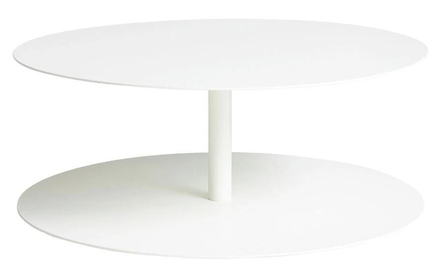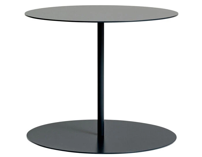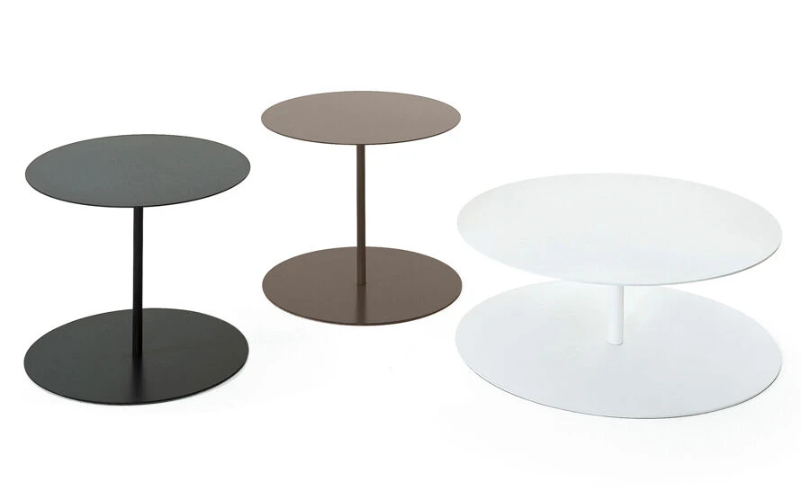 The Gong table is a signature design by Giulio Cappellini. The round top is made of laser-cut sheet metal, connected to the base with a tubular iron leg.