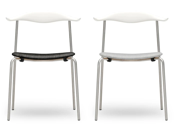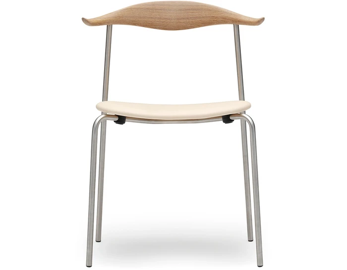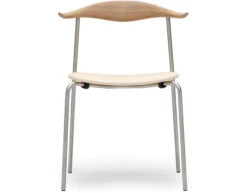 The CH88P is versatile both in terms of its appearance and usability thanks to its numerous finish, frame, and room placement options. Characteristically, the upper structure features a steam-bent wooden backrest for back support, with slight curvatures of the backrest’s ends providing a natural resting place for the arms. The steel frame, with straight back legs, supports an oval-shaped wooden seat. This blend of materials, combined with a minimalist design, results in a light, organic, industrial expression. And the new, stackable design (stackable up to 4 chairs) offers a valuable benefit. The CH88 is available in beech and oak in a range of finishes. The frame is available in stainless steel, powder coated or chrome, and the seat with optional leather or textile upholstery.