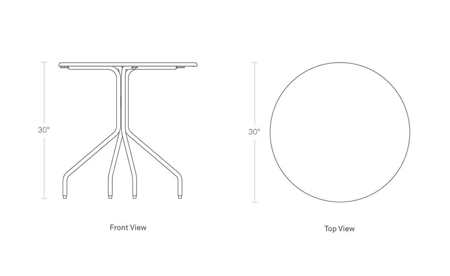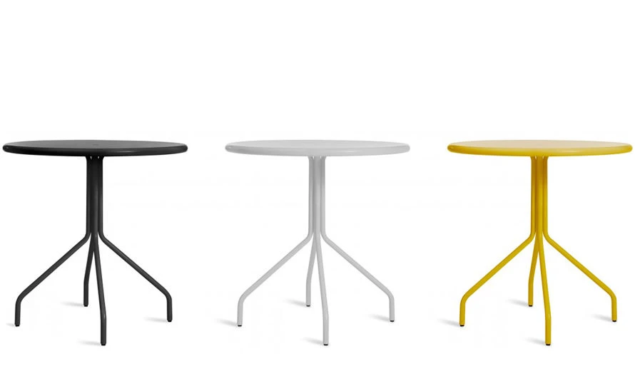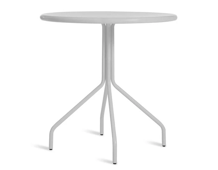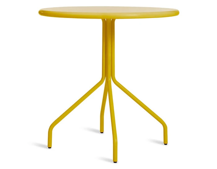 The Hot Mesh Cafe table features a zinc-plated powder-coated steel with adjustable nylon glides for leveling and drainage hole at the center of the table top. Suitable for outdoor use. Assembly required.