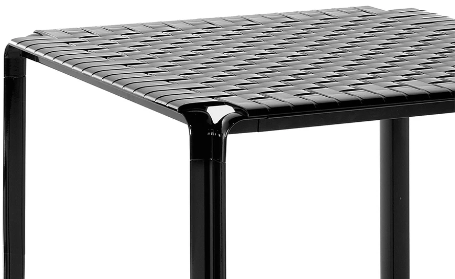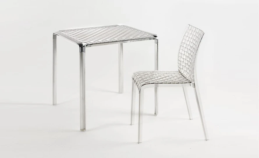 Inspired by the play of warp and weft in woven fabric, Tokujin Yoshioka wanted to use this stylistic symbol typical of his culture, weaving, and thus recreated it in the Ami Ami chair and table whose name in Japanese literally means “weave”. The simple squared off lines contrast with the rich texture of the weaving reproduced on the inner and outer surfaces through a complex industrial process recreating the motif with a single mold. Ami Ami combines the appeal of oriental culture with the use of innovative materials like polycarbonate and comes in two transparent clear and smoked versions and three matte versions of white, red and black. The Ami Ami seat matches the table with a square polycarbonate top measuring 27.5″ x 27.5″ covered by the weaving motif and painted aluminum legs.