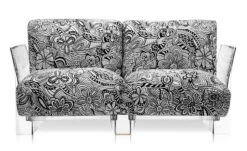 Pop Missoni settee features a transparent or black polycarbonate frame with goose down and flock filled cushions upholstered with Missoni fabric.