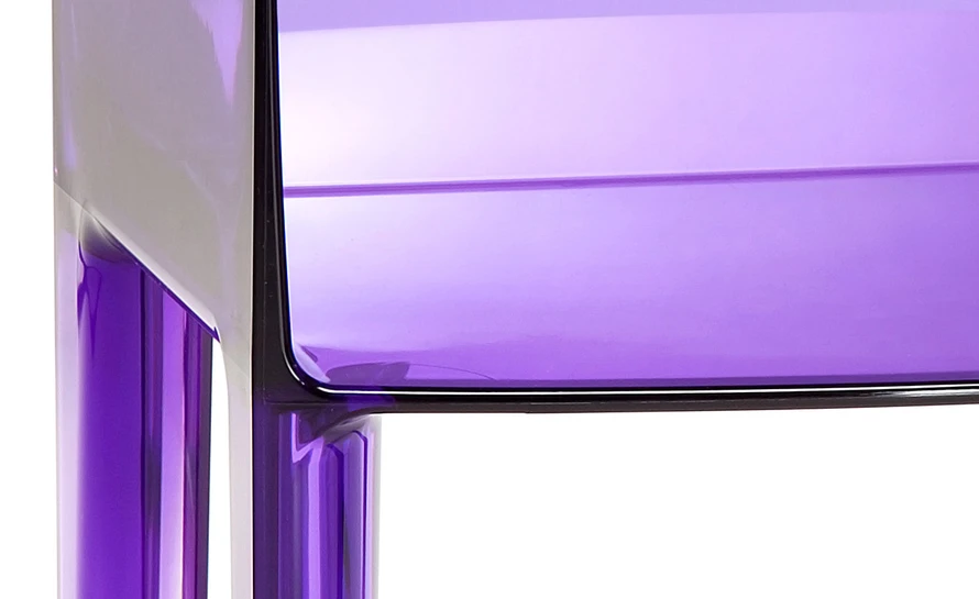 Night table version of the Ghost Buster commode. A little squared cube on four legs, available in completely transparent, colored or solid glossy versions made of plastic. Like its “older brother”, Small Ghost Buster also plays with reflections and perspectives created by the alternating of the corners and curves over the entire surface. Starck designed this simple flexible object which is at home in any corner of the house.