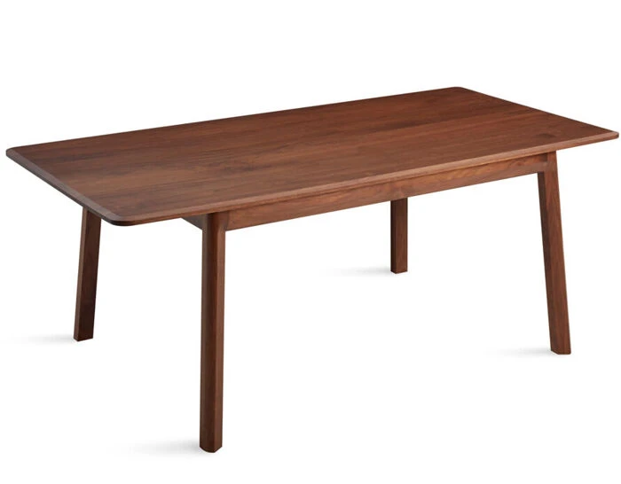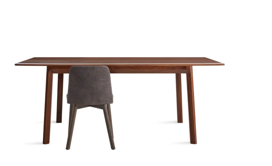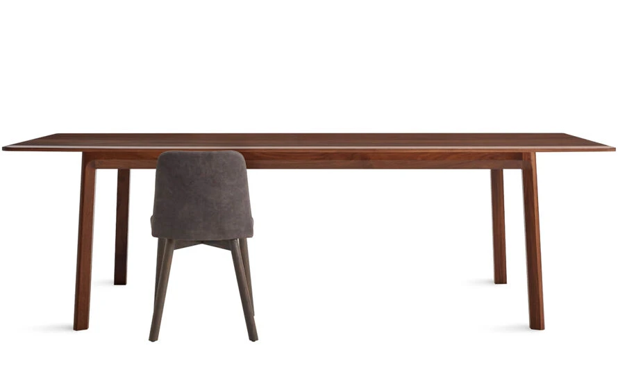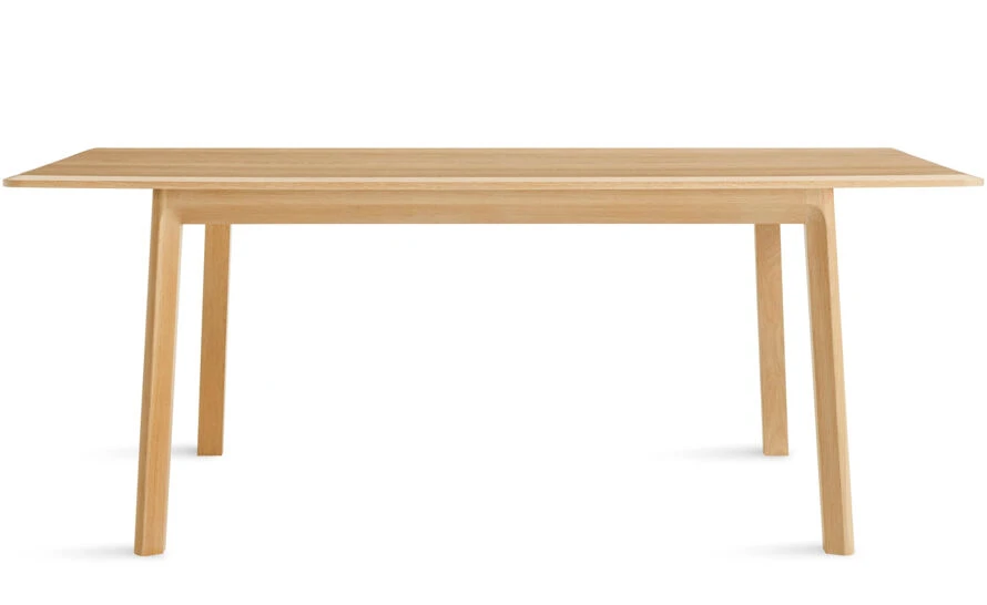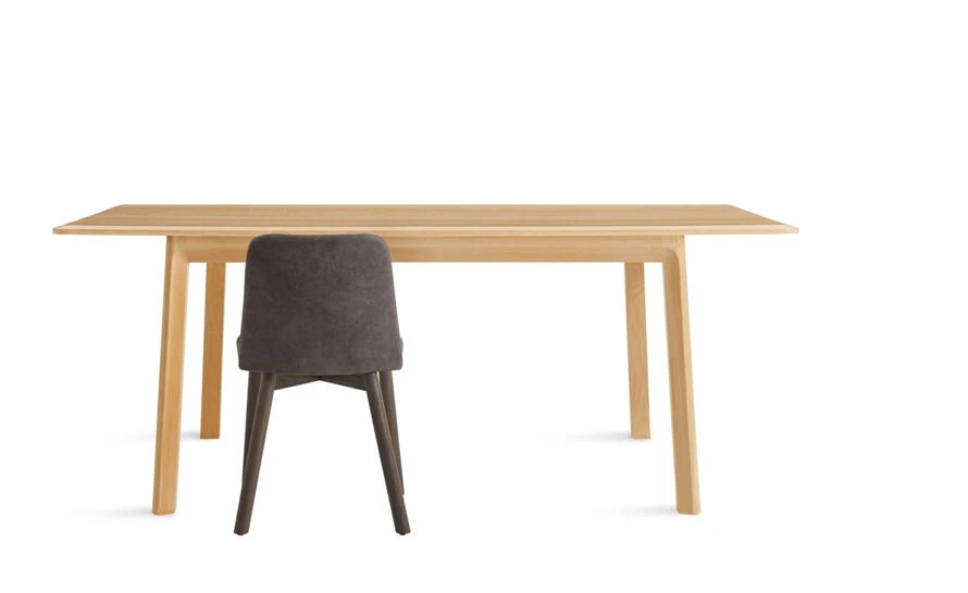 Blu Dot’s goal with Keeps was to create a minimal solid wood table that celebrated the beauty of the material. Graceful, chamfered edges soften the silhouette, while exposing the grain of the wood. They also make the table ends more inviting – allowing two people to squeeze in without bumping into anything. They carried this subtle angled detail to the inside of the legs, bringing the top and base together. Wood is often shipped overseas, sometimes causing it to bow or split. They worked with a manufacturer in nearby Wisconsin to make sure the wood looked good from start to finish.