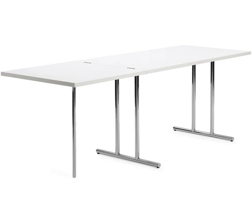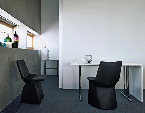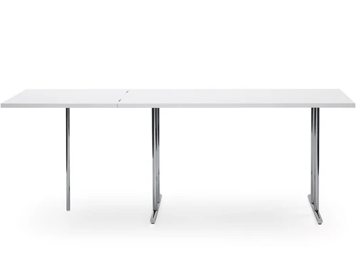 Like the majority of Eileen Gray’s tables, this one too can transform itself. And, as always, she found an unexpected solution. The folding section of the tabletop is supported by a single leg out of chromed steel tubing – a conscious break in the otherwise perfect symmetry of the table. It is named after Eileen Gray’s last home, Lou Perou, that she built at the age of 76 above St. Tropez. The name itself is in memory of a trip to Peru in the year 1929.