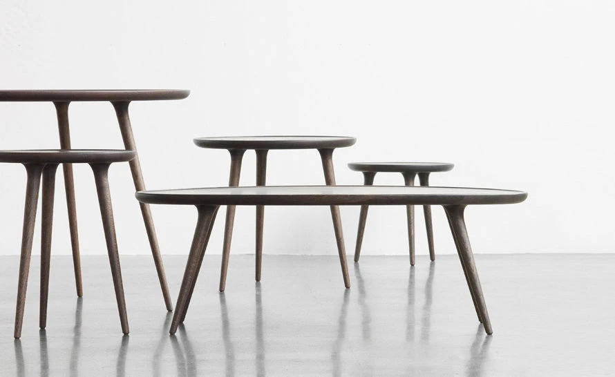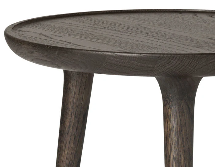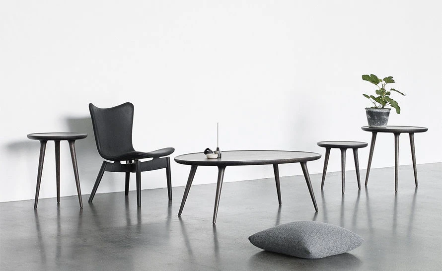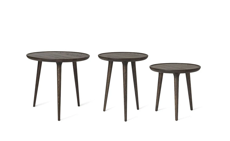 The Mater Accent Side Tables are designed by the Danish architect duo Space Copenhagen and combines a sculptural and handcrafted aesthetic. Following along the same bloodline as the highly successful 2009 Mater High Stool, the Accent collection consists of three coffee tables, a larger oval lounge table and round dining table. Crafted in solid FSC certified oak with a sirka grey stain or matte lacquered.