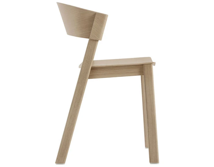 The Cover Side Chair is made in wood with a water-based lacquer, the curved back and seat in veneer and its base and legs in solid wood. The wood is folded around the chair’s front legs. This technically innovative wood layering helps lock the elements of the chair together.