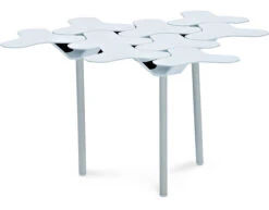 The Nanook collection is composed of a chair and a low table. It reflects a study of the passage from two to three dimensions based on observing the tanning of a quadruped’s hide. Nanook table sits on three legs, has a steel top, frame and legs and available with a glossy white, green, red or blue enamel finish. The table’s top is comprised of separate die-cut steel plates that abstractly suggest the hexagonal structure of a snowflake. Tabletops interlock with each other in combinations of multiples, and can also be stacked: table legs connect through top’s interstices.