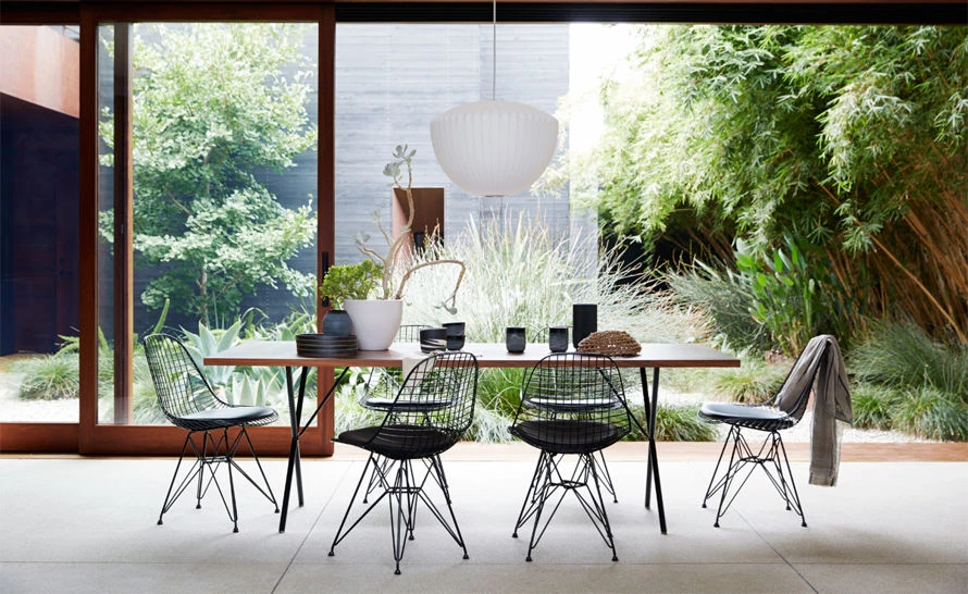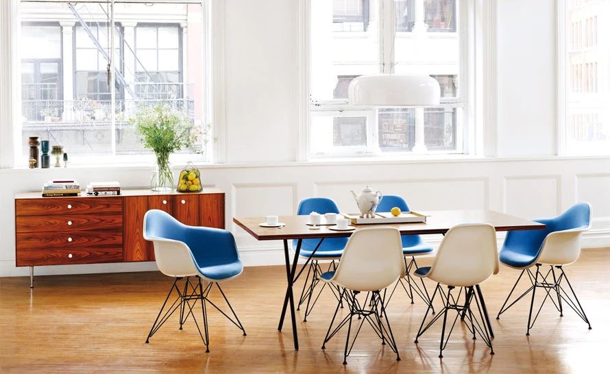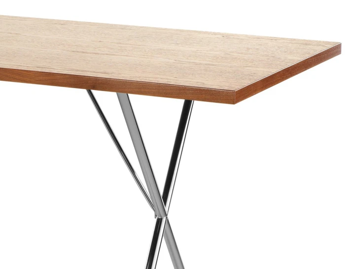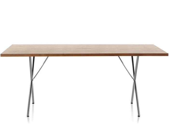 Over sixty years after its original introduction in 1950, the elegant, versatile X-Leg table by George Nelson is again available from Herman Miller. In many ways, the X-Leg table was the first multi-use table designed by the Nelson Office: it was first promoted as a dining table as well as a work surface. Designed to function in almost any setting, it easily balances everything from dining to working to relaxing. The table similarly pairs with a variety of chair styles, from classic Eames offerings to modern designs.