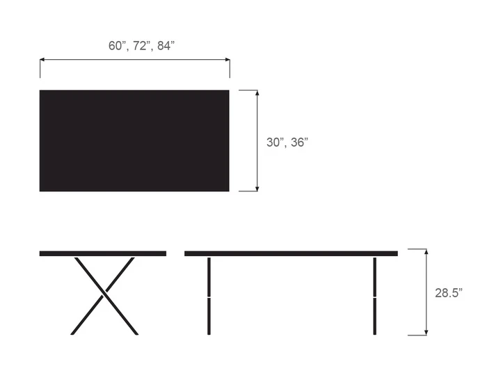 30″ or 36″ d | 60″, 72″ or 84″ w | 28.5″ h | top: .786″ thick