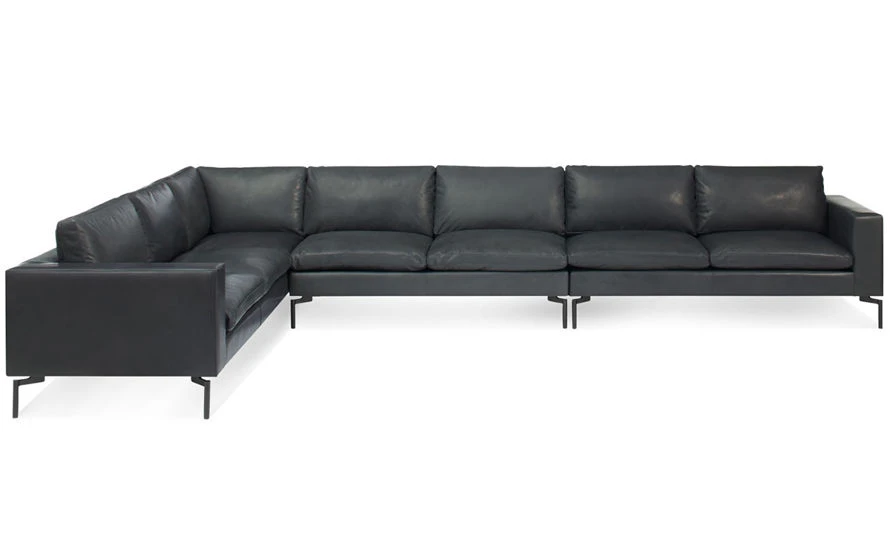 Sometimes it is not about starting from scratch, but rather revisiting past designs and making them better. The New Standard leather sectional sofa is simplicity at its best with a twist. Wide arms and inviting loose cushions all come together with tuned proportions and show stopping legs. Now Available in durable and sumptuous leather upholstery options. Also available with fabric upholstery. The New Standard large leather sectional sofa is only offered in the configuration shown in images.