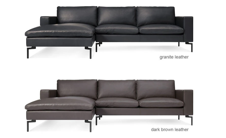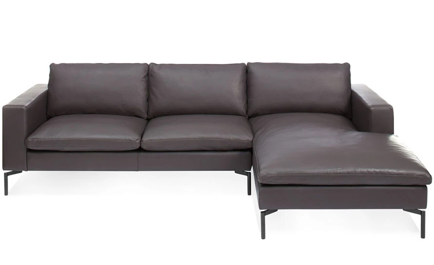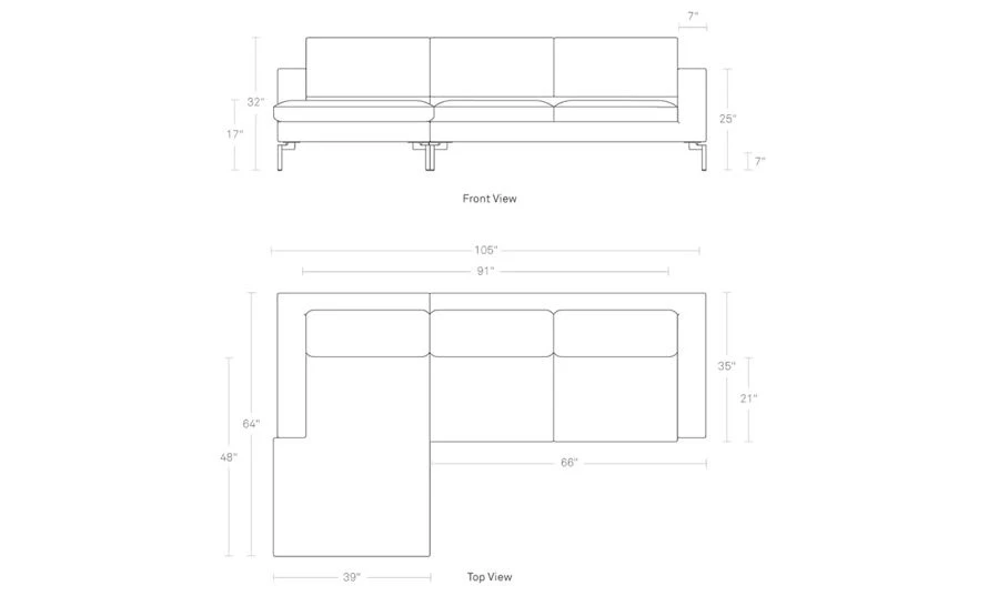 new standard leather sofa with chaise: 105″ w | 32″ h | 35″ d | seat: 17″ h | arms: 7″ w | legs: 7″ h