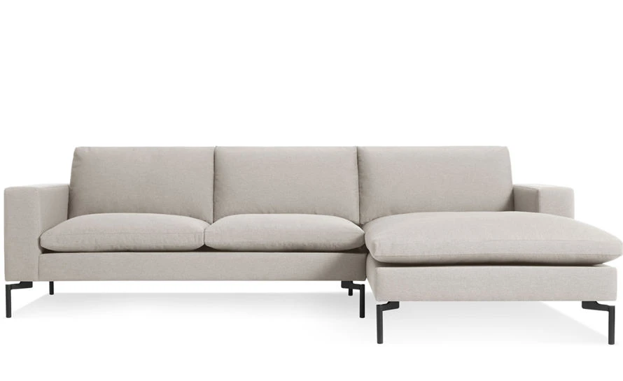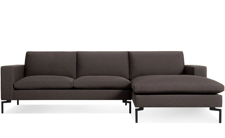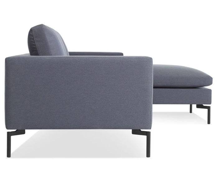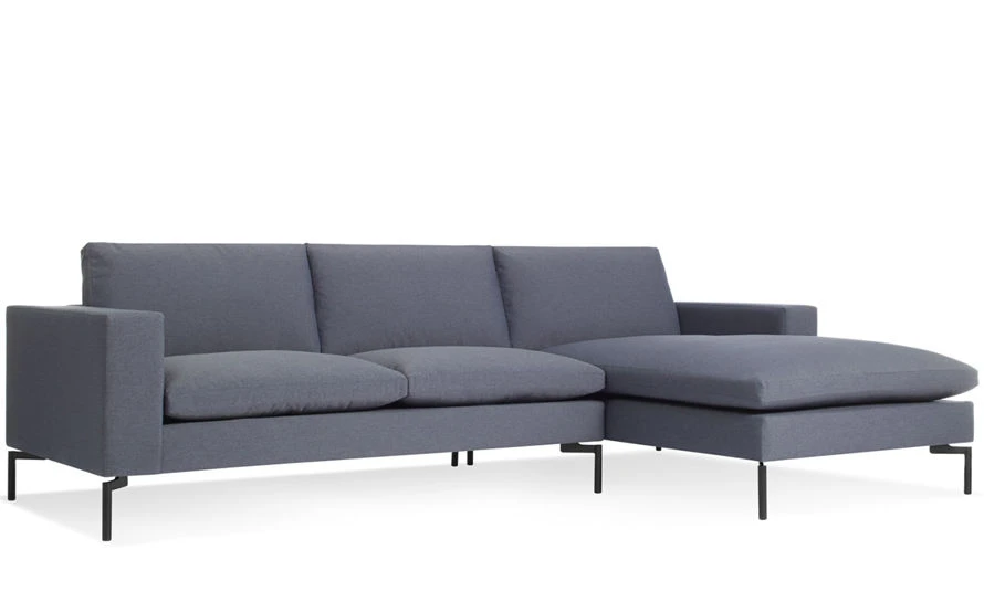 Sometimes it is not about starting from scratch, but rather revisiting past designs and making them better. The New Standard modern sofa with chaise is simplicity at its best with a twist. Wide arms and inviting loose cushions all come together with tuned proportions and show stopping legs. The New Standard series is offered in four fabrics, two leathers, two leg finishes and an array of shapes to suit any space.