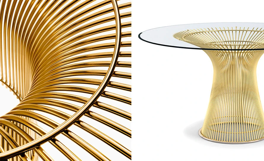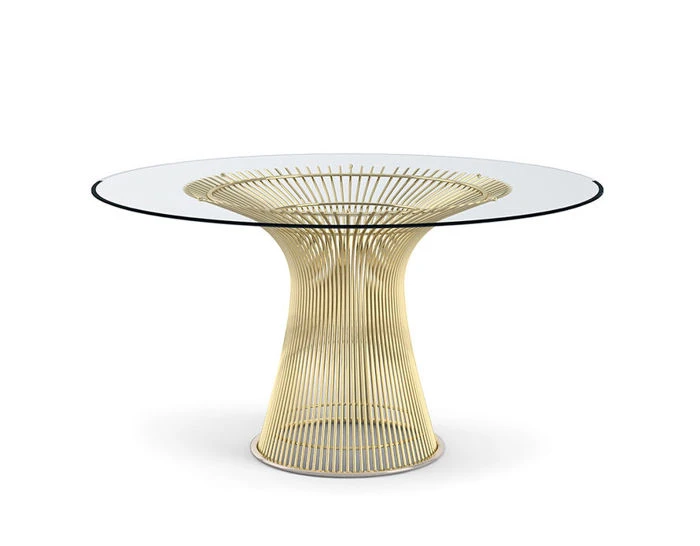 The frame of the Platner table collection features vertical steel wire rods welded to circular horizontal and edge-framing rods. The Base has a clear plastic extrusion ring that creates a smooth bottom surface. This collection is offered in your choice of a variety of top options and the base is finished in either a bright nickel with a clear lacquer, painted metallic bronze or plated in 18K gold with a clear lacquer finish.