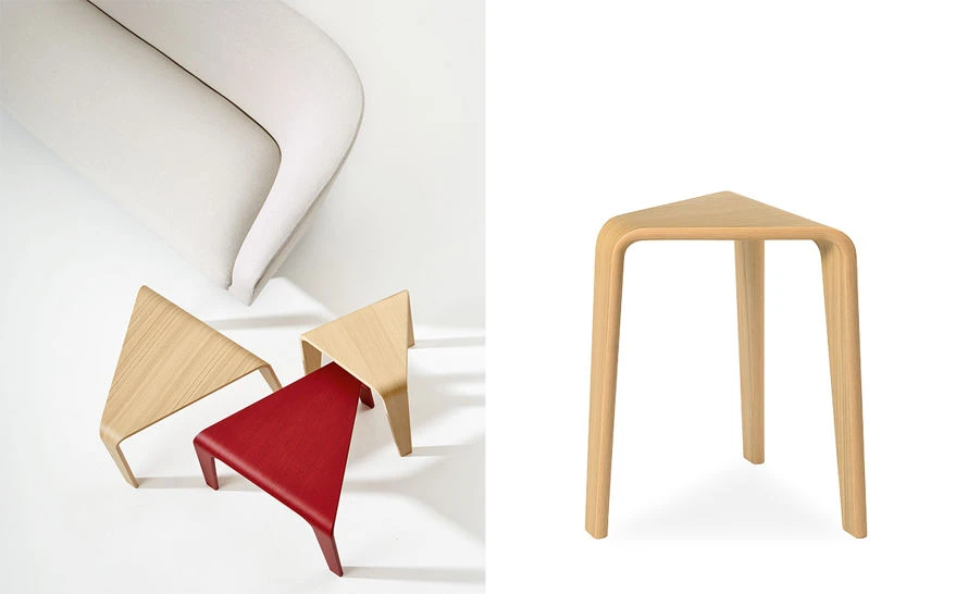 Triangular in form and modular in nature, Ply is a system of low tables and stools rendered in fluid lines of wood. Engineered to create a continuous line from top through legs, its reduced silhouette and warm material complement its dynamic form. Alone or in groups, Ply’s playful geometry of surfaces is like the game of Tangram, shape and color work together to create open compositions. The collection is available in different sizes and heights in oak, black and red finishes.