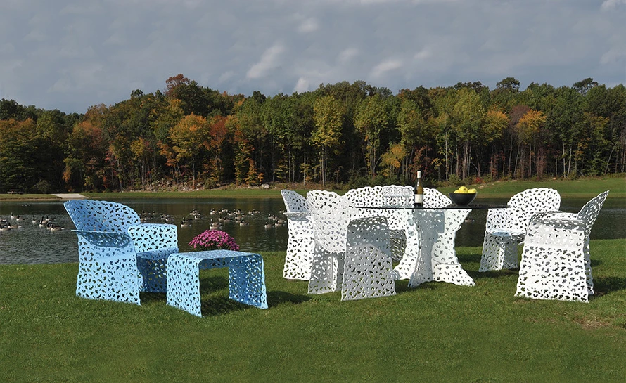 Richard Schultz designed the Topiary collection to look like shrubs pruned to look like furniture. The whimsical pieces act as light filters, disappearing into nature and creating patterns of dappled light on the ground below.