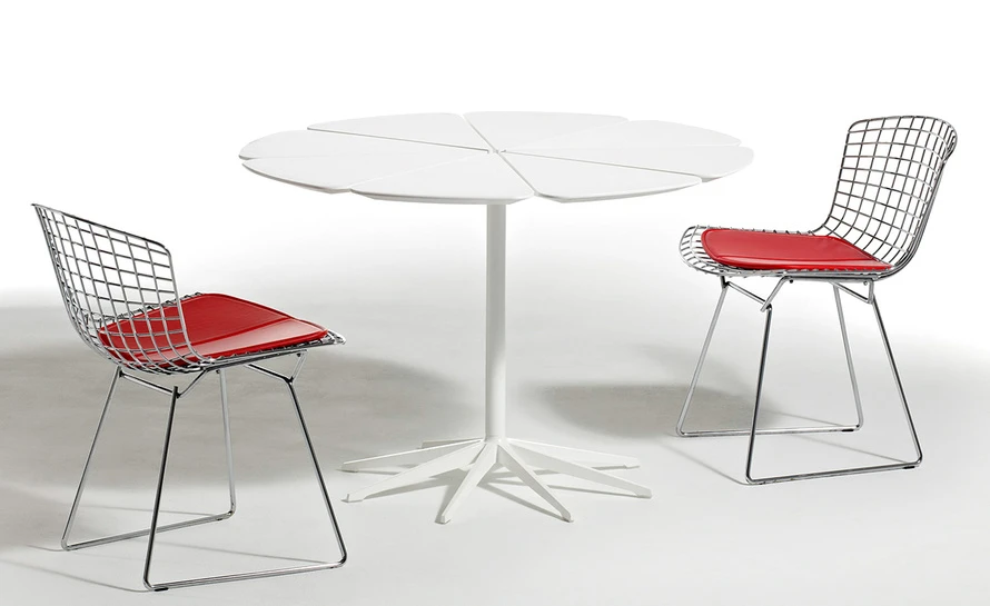 “I designed the Petal Table to accompany the Bertoia Chairs that Harry Bertoia designed for Knoll. The tops on these tables are made of eight petals, which are mounted on a beautifully crafted cast aluminum spider. I was inspired by Queen Anne’s Lace, a weed that grows near our house in Pennsylvania. Each cluster of flowers is supported on its own stem. By making a table in this manner there is no need for a ring support, and each petal is independent which allows the table to expand and contract with the weather.” The tables were introduced by Knoll in Los Angeles in 1960 and were immediately made part of the MoMA Design Collection.