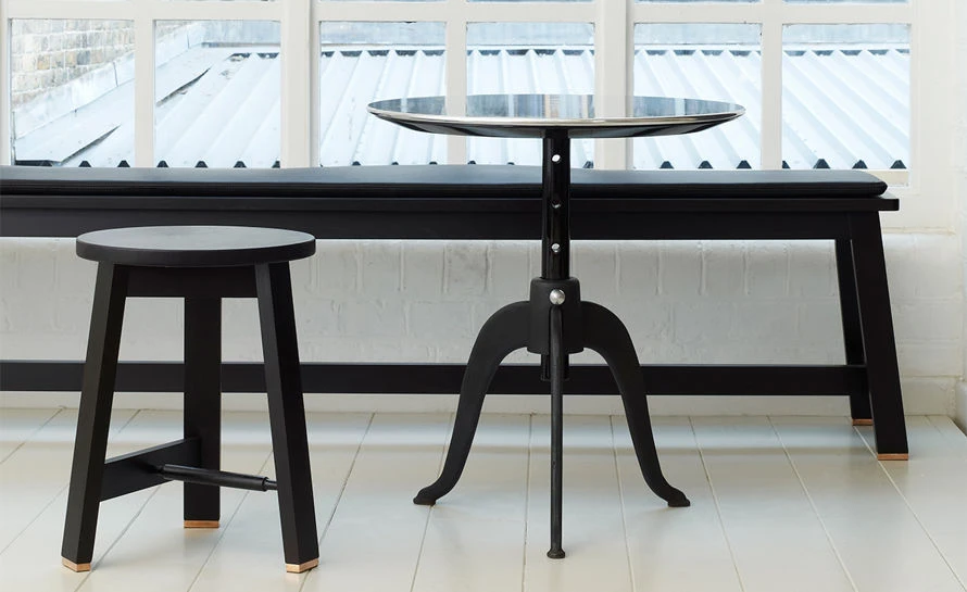 Sidekicks is a series of small occasional tables that live throughout the home to accommodate our different activities. They are the right height and dimension to sit next to sofas and chairs, for drinks and snacks, papers and magazines, or a short time on the laptop. Sidekicks Height Adjustable table is available with cast iron legs that allow the polished aluminum tabletop to be raised to five different heights. Designed by Studioilse and manufactured by De La Espada for the Studioilse brand.