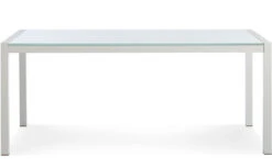 Modern outdoor square table designed with crisp minimal white powder-coated aluminum and tempered sandblasted glass top. The entire Skiff collection offers clean lines designed to weather the elements.