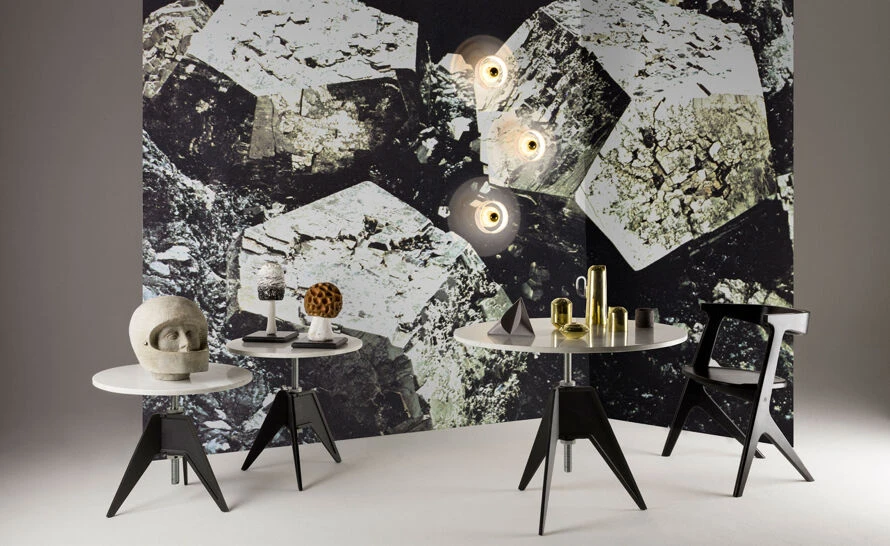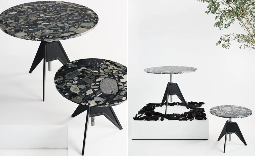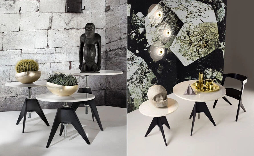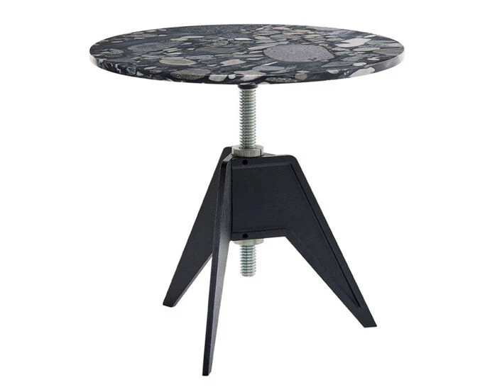 A Screw table was inspired by the materials and processes employed during the Industrial Revolution. The aluminum thread allows for multiple heights by simply spinning the top. The lock bolt secures the desired position. Available in two different sizes: cafe and side table.