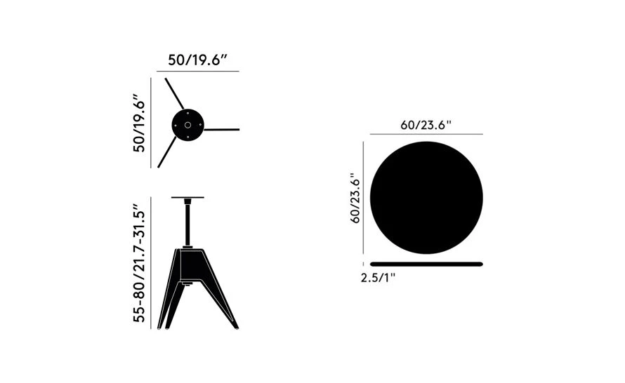 screw side table: 17.7″ – 24.4″ h | top: 23.6″ dia.