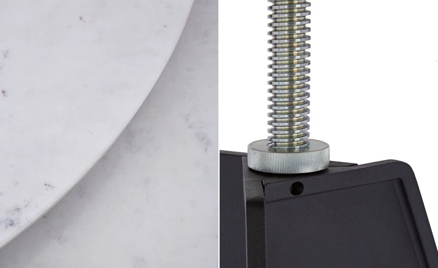 The tripod base is made from sand cast iron. The process involves compacting sand into a casting box around a tool which is carefully removed by hand. Liquid iron is poured into the cavity to form the shape. Once solidified, it is machined and hand polished to create the black powder coated finish. The marble tops are machine cut. Variations in the color of the marble may occur.