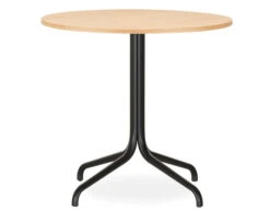 The Belleville Tables are modeled on the typology of the classic bistro table, but thanks to the selection of solid wood, veneer, melamine or HPL table tops, their appearance is highly variable. The slender legs flow in a continuous sweeping line from the splayed bottom along the central column to the table top. In star-shaped or paired configurations, they form bases for small and large bistro tables or dining tables.